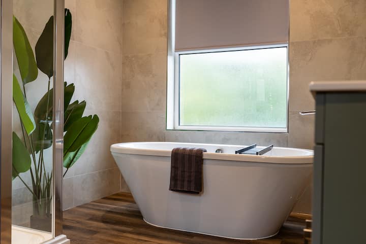 – Clean, generously sized bathroom with modern fixtures