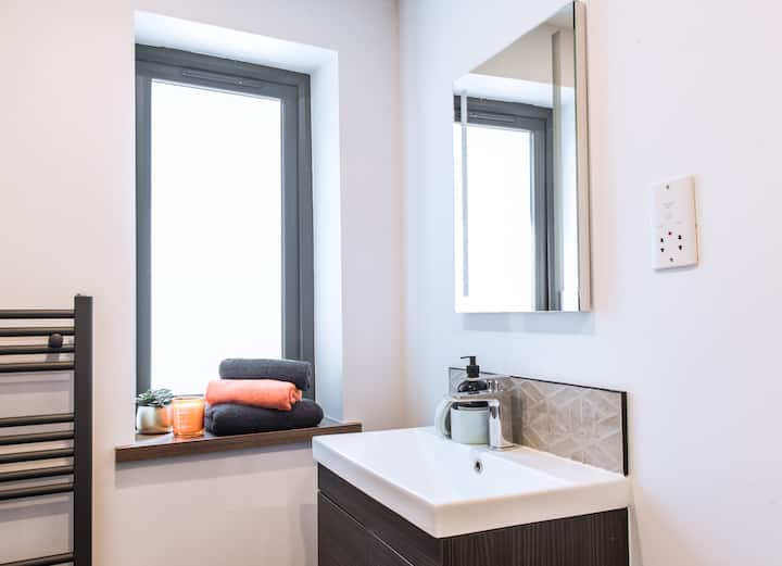 A generous bathroom with a quality shower, vanity light and mist-free bathroom mirror.